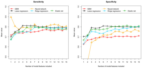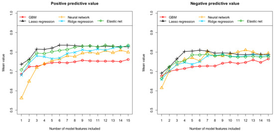 Firstly, Table 2 summarizes the results obtained with these five different machine learning algorithms after performing feature preselection using RFE. Figure 2, Figure 3 and Figure 4, on the other hand, show the results obtained with the most important 1 to 15 features. Here, the performance results achieved in terms of AUC and accuracy are summarized in Figure 3, in terms of sensitivity and specificity in Figure 4, and finally in terms of the positive and negative predictive values in Figure 5. As previously explained, all results were determined based on independent (unknown) test data and as mean values of 100 complete runs (each run consisting of a complete model development and subsequent testing). The models achieve their highest performance in the range between 6 and 12 features. If more features are used, the performance does not increase any further or even begins to decrease slightly. This characterizes the beginning of an overfitting. On average, 22.1 and 17 features are selected when using RFE (mean number and median, respectively). Models with this number of features are already slightly overfitted, which in turn implies that the models developed with RFE perform slightly worse on average than the best models developed with our alternative feature preselection method.