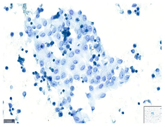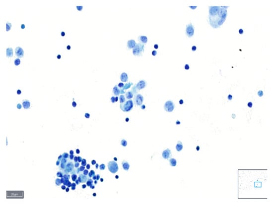 Figure 8 and Figure 9 show representative images of benign and malignant cells in effusions, stained with BlueStain. We can observe the nuclei and cytoplasmic details that allow for a correct diagnosis/classification of the case.