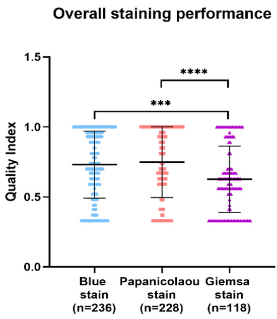 In the comparative analysis of staining techniques for a series of cytology samples, the Papanicolaou stain demonstrated superior quality index results, followed by BlueStain and the Giemsa stain. Statistically significant differences were observed, with the Giemsa stain exhibiting a notably lower quality index compared to BlueStain and the Papanicolaou stain (Figure 4). The p-values for the overall comparisons were as follows: BlueStain vs. Papanicolaou (p = 0.9241), BlueStain vs. Giemsa (p = 0.0005), and Papanicolaou vs. Giemsa (<0.0001) (Appendix A Table A1).