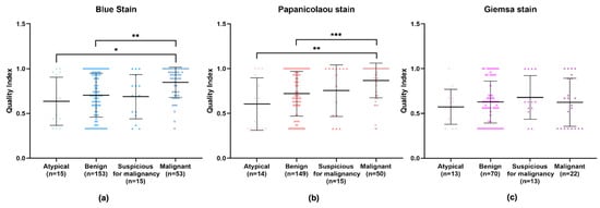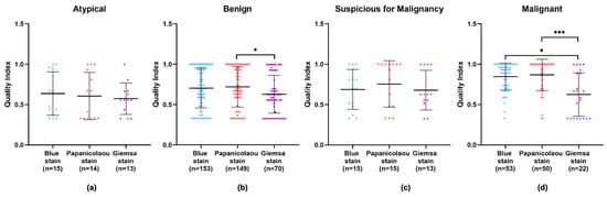 Upon an isolated analysis of each stain, the benign, suspicious for malignancy, and malignant categories demonstrated higher quality indexes compared to the atypical category (Figure 6). Specifically, BlueStain revealed a statistically significantly higher quality index for the malignant category over the benign and atypical categories (Figure 6a and Appendix A Table A3). A similar pattern was observed with the Papanicolaou stain (Figure 6b and Appendix A Table A3). Although no statistically significant differences were noted within the categories for the Giemsa stain (Figure 6c), it is noteworthy that the suspicious for malignancy category scored the highest quality index.