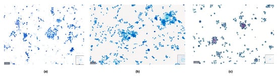 A smear was prepared from the sediment or concentrated cells on a slide, with a brief air-drying period if required. Priority in staining was given to our BlueStain technique [12]. Each prepared smear slide was dipped in BlueStain for 90 s and then gently rinsed by dipping in tap water 5–7 times. In cases where additional slides were available, they were stained using Papanicolaou and Giemsa stains according to the classical protocols [9,10,11,12,13]. This approach allowed for a comprehensive evaluation of the serous effusion samples, utilizing the advantages of each staining method to provide a thorough cytological analysis.