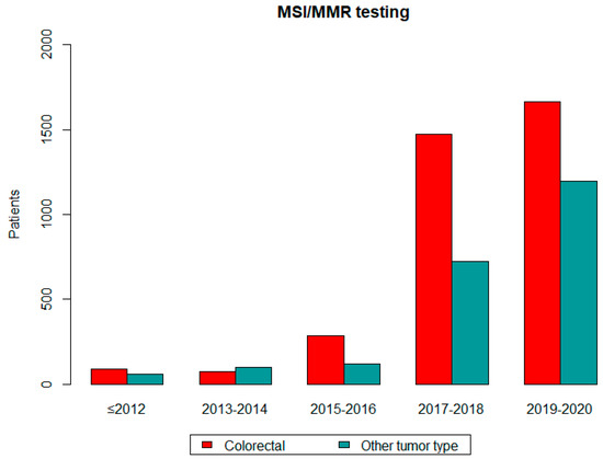 A statistically significant increase in MSI/MMR testing was observed in patients with colorectal cancer overtime: 91 (≤2012), 71 (2013–2014), 283 (2015–2016), 1475 (2017–2018) and 1662 tumors (2019–2020) (p < 0.05). Similarly increased referral numbers were observed in patients with other tumor types. Referrals in association with time are shown in Figure 2. The graph shows a significant increase in MSI/MMR testing, both in patients with colorectal cancer and with other tumor types.