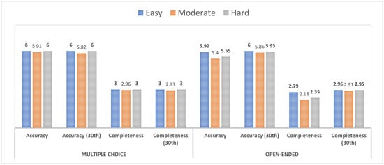 For multiple-choice questions, accuracy was consistently high across all difficulty levels, with 6.00 for both easy and hard and a marginally lower score of 5.91 for moderate difficulty. This pattern persisted on the 30th day, with scores remaining at 6.00 for easy and hard levels and a slight decrease to 5.82 for moderate difficulty (Figure 1). Completeness was stable across difficulty levels at 3.00, with a negligible decrease observed in moderate difficulty (2.96) and at the 30th day for moderate difficulty (2.93). Open-ended tasks showed a variable pattern. Accuracy scores decreased with increasing difficulty: 5.92 (easy), 5.40 (moderate), and 5.55 (hard). However, on the 30th day, the scores were 6.00 (easy), 5.86 (moderate), and surprisingly higher at 5.93 (hard). Completeness scores for open-ended tasks were lower than those for multiple-choice tasks, with the highest score being 2.79 for easy difficulty, dropping to 2.18 for moderate and increasing slightly to 2.35 for hard. On the 30th day, the scores saw an upward trend, resulting in 2.96 (easy), 2.91 (moderate), and 2.95 (hard).