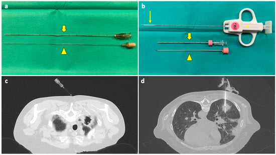 - Saji, H.; Nakamura, H.; Tsuchida, T.; Tsuboi, M.; Kawate, N.; Konaka, C.; Kato, H. The Incidence and the Risk of Pneumothorax and Chest Tube Placement After Percutaneous CT-Guided Lung Biopsy. Chest 2002, 121, 1521–1526. [Google Scholar] [CrossRef] [PubMed]
