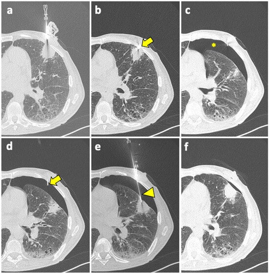 - Hiraki, T.; Mimura, H.; Gobara, H.; Shibamoto, K.; Inoue, D.; Matsui, Y.; Kanazawa, S. Incidence of and Risk Factors for Pneumothorax and Chest Tube Placement After CT Fluoroscopy–Guided Percutaneous Lung Biopsy: Retrospective Analysis of the Procedures Conducted Over a 9-Year Period. Am. J. Roentgenol. 2010, 194, 809–814. [Google Scholar] [CrossRef]