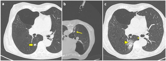 - Huang, M.-D.; Weng, H.-H.; Hsu, S.-L.; Hsu, L.-S.; Lin, W.-M.; Chen, C.-W.; Tsai, Y.-H. Accuracy and complications of CT-guided pulmonary core biopsy in small nodules: A single-center experience. Cancer Imaging 2019, 19, 51. [Google Scholar] [CrossRef] [PubMed]