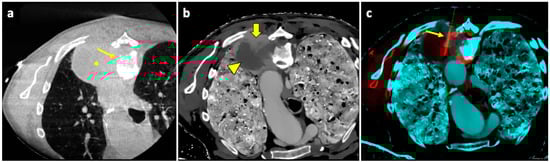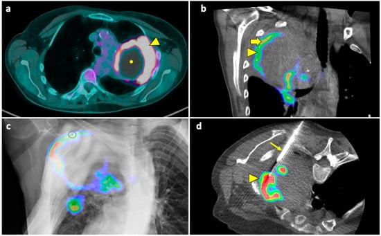 CT is also useful in selecting the appropriate imaging guidance modality, in selecting the patient’s position and needle type, and in planning the best needle trajectory based on the lesion location and the surrounding bronchovascular structures, fissures, and bullae, keeping in mind that the length of the parenchyma crossed should be minimized [52]. As for contrast administration, the advantages of pre-procedural contrast-enhanced CT images include the demonstration of the nature of the target lesion, the definition of any cystic or necrotic components, and the detection of significant vessels within the lesion. 18F-FDG PET is useful in identifying the metabolically active portion of a pulmonary lesion, which needs to be targeted after visual or digital images coregistration to improve accuracy [53,54].