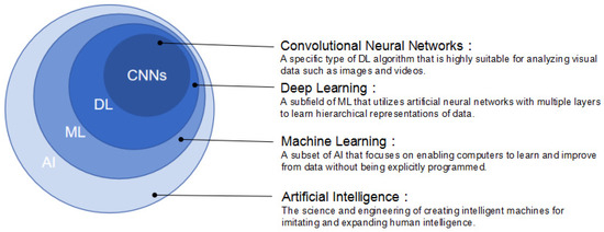 Convolutional neural networks (CNNs) are a type of DL algorithm that is highly suitable for analyzing visual data such as images and videos [25]. CNNs are designed to automatically and adaptively learn spatial hierarchies of features from the input data through the use of convolutional layers, which apply filters (also known as kernels) to the input data to extract relevant features. These filters are learned during the training process, allowing the network to identify patterns such as edges, textures, and shapes at different scales [26,27]. CNNs also typically include other types of layers, such as pooling layers, which downsample the feature maps to reduce computational complexity, and fully connected layers [28].