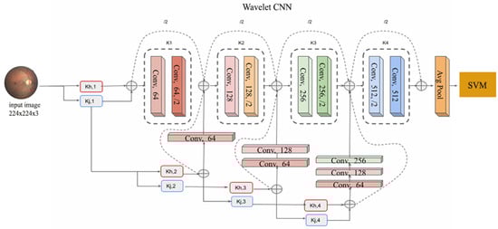 The architecture of the proposed model is shown in Figure 1. The Wavelet CNN architecture utilises several techniques to process input images. Initially, convolution layers are used with 3 × 3 kernels and 1 × 1 padding. Convolutional kernels of size 3 × 3 with a stride of 2 and 1 × 1 padding are used to reduce the feature map size. Additionally, the input image undergoes multiresolution analysis, decomposing it into different images representing various frequency components. These decomposed images are then concatenated channel-wise. Projection shortcuts are implemented using 1 × 1 convolutions. The output of the convolution layers is vectorised through global average pooling. The Support Vector Machine (SVM) classifier categorises the feature vector from the previous layer into different grades. Low-pass and high-pass filters are indicated by and , respectively. Conventional CNNs can be considered a constrained version of multiresolution analysis using kernel without a characteristic hierarchical decomposition. This limited analysis fails to fully capture the rich hierarchical structure of multiresolution analysis, which can enable more efficient and effective information processing. To compensate for the missing part caused by , the model introduces an extra set of . These new filters are employed to establish multiresolution analysis using wavelet transform, which is integrated into the neural network architecture. Performing multiresolution analysis necessitates carefully selecting filters, as arbitrary filters cannot fulfil this purpose. The choice of filters, including and , plays a critical role in capturing the desired features and characteristics of the input signal or image at various scales or resolutions. This is due to the fact that filters with distinct frequency responses can extract diverse information from the input data and represent it at varying levels of intricacy. Hence, the choice of filters is crucial in accomplishing effective multiresolution analysis.
