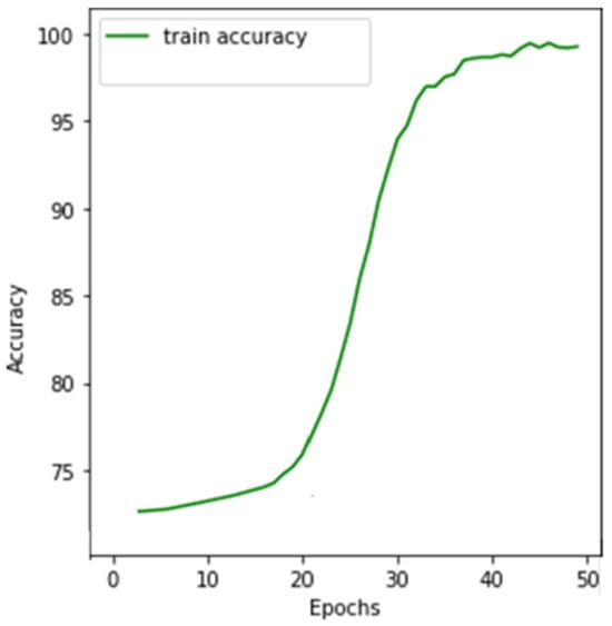 The EyePACS dataset was then divided into 80%–20% for training and testing. The fundus images were trained with Wavelet CNN, and the architecture took 11,799,109 parameters to learn. The training converged with 50 iterations, which took 13.4 h to complete. The training accuracies of Wavelet CNN obtained over various iterations are shown in Figure 4. The training accuracy converged to 96.2% by the end of iterations with early stopping. Furthermore, the training loss converged to 0.35 by the end.