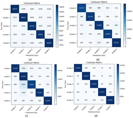 As shown in Table 2, the Wavelet CNN model demonstrates a decent performance in classifying DR into five grade classes. It achieves a precision of 0.857, indicating that it accurately identifies positive cases. The recall score of 0.849 suggests that the model effectively captures approximately 84.9% of the actual positive cases across the different grades of DR. The F1-score of 0.853 represents a balanced measure of precision and recall. However, the model’s accuracy is limited to 73% among five grade classes. Furthermore, the average AUC score of 0.602 (Figure 6a) suggests that the model’s ability to distinguish between positive and negative instances is relatively low. Incorporating XGBoost into the Wavelet CNN model shows notable improvements in the classification of DR into five grade classes. The combined model achieves a high precision of 0.9412, indicating an accurate identification of positive cases across different DR grades. The recall score of 0.8973 suggests that the model successfully captures approximately 89.7% of the actual positive cases across the different grades. The F1-score of 0.9186 signifies a harmonious balance between precision and recall. Moreover, the model’s accuracy significantly improves to 89.24%, indicating more correct classification. The high average AUC score of 0.976 (Figure 6b) indicates a strong ability to distinguish between positive and negative instances. The combination of the Wavelet CNN model with random forest yields a remarkable performance. The model achieves a precision of 0.940, implying the accurate identification of positive cases across different DR grades. With a recall score of 0.937, the model effectively captures about 93.7% of the true positive cases across diverse grades. It achieves a balanced trade-off between precision and recall, as reflected by the F1-score of 0.939. Furthermore, the model achieves a high accuracy score of 0.9095, indicating the correct classification of 90.95% of the cases across the five grade classes. The average AUC score of 0.978 (Figure 6c) shows good discrimination capability between the different DR grades. The model combining Wavelet CNN with SVM achieves a precision of 0.9831, recall of 0.9822, F1-score of 0.9831, accuracy of 0.9895, and AUC score of 0.99. The precision value shows a high proportion of true positives compared to false positives. The recall value indicates that the model captures almost all instances of the positive grade class. The F1-score of 0.9831 represents an excellent balance between precision and recall. The average accuracy of 0.9895 (Figure 6d) indicates a high rate of correct predictions. An AUC score of 0.99 indicates a strong ability to distinguish between positive and negative instances.