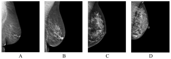 Classification of breast tissue density according to BI-RADS Atlas Fifth Edition classification [4]. Examples of the breast in left mediolateral (LMLO) projection: Class (A) = the breasts are almost entirely fatty. Class (B) = there are scattered areas of fibroglandular density. Class (C) = the breasts are heterogeneously dense, which may obscure small masses. Class (D) = the breasts are extremely dense, which lowers the sensitivity of digital mammography.