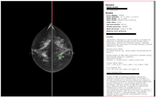 The proposed deep learning-based automatic detection algorithm (DLAD, Carebot AI MMG v2.2; Prague, Czech Republic) analyzes full-field digital mammography (FFDM) studies in the standard left (LCC) and right craniocaudal (RCC), and left (LMLO) and right mediolateral oblique (RMLO) view. The images are initially directed to a preprocessing module, which eliminates extraneous components from the images and implements image filtering techniques. The images are then classified by the DLAD’s multi-class classifier, adhering to the BI-RADS breast density classification standards. Designed to augment the decision-making process in screening clinical practice, the DLAD is designed for seamless integration with picture archiving and communication systems (PACS) and DICOM viewers (Figure 2) using DICOMweb and DIMSE protocols.