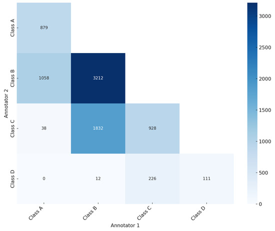 Confusion matrix showing the agreement and disagreement among annotators in breast density assessment according to BI-RADS breast density classification.