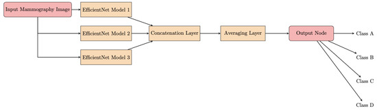 The architecture of the proposed DLAD leverages the model soup approach [22], which involves creating an ensemble model by aggregating weights from multiple independently fine-tuned EfficientNet [23] models. This methodology produces a single model that incorporates the collective attributes of several configurations, each characterized by unique optimizations of the hyperparameters [24]. The foundation of the DLAD architecture is represented by EfficientNet, a scalable convolutional neural network (Figure 4). A major innovation of the network architecture is the methodical scaling of the network’s dimensions—depth, width, and image resolution—to achieve an optimal balance between computational efficiency and model performance. The scalability of EfficientNet enables adaptation to varying dataset characteristics and analytical objectives.
