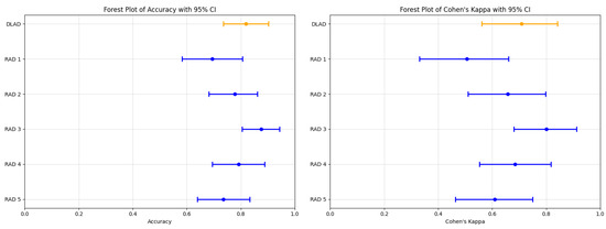 Forest plots illustrating the performance comparison between the proposed DLAD (Carebot AI MMG v2.2) and assessed radiologists (RAD 1–RAD 5) in terms of Accuracy and Cohen’s Kappa (). Orange lines indicate DLAD, blue lines indicate RAD 1–RAD 5.