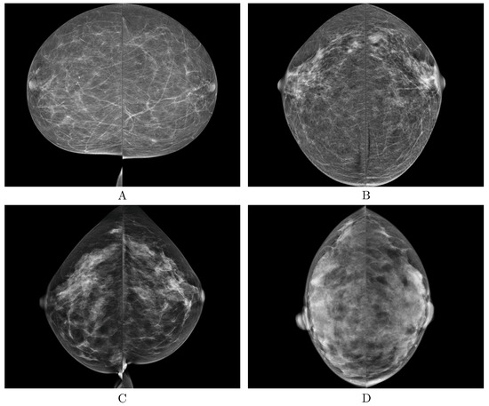 Population-wide breast cancer screening initiatives have been instrumental in reducing mortality, with high adherence to regular screenings significantly impacting outcomes [1]. Despite significant advancements, breast cancer remains the leading cause of cancer-related deaths among women globally. The effectiveness of current mammography screening protocols has been questioned due to the prevalence of recalls and false positives, which often result in unnecessary biopsy procedures [2]. Breast tissue density is a key determinant in the detection of breast cancer, as it can obscure tumor visibility and is independently linked to a heightened risk of developing breast cancer [3]. To standardize breast density evaluations, the American College of Radiology (ACR) introduced the Breast Imaging-Reporting and Data System (BI-RADS) [4] for breast density assessment (Figure 1). However, the classification system has faced challenges due to the significant interobserver variability among radiologists, leading to inconsistencies and uncertainties in assessments [5,6,7].