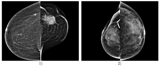 The most problematic images for classification, i.e., those where the proposed DLAD most frequently misclassified mammography studies according to BI-RADS density categories, involved images from Institution 3. In particular, images containing significant malignant lesions, metal artifacts, clips, and other dimensional factors and objects present in the scans were misclassified (Figure 7).