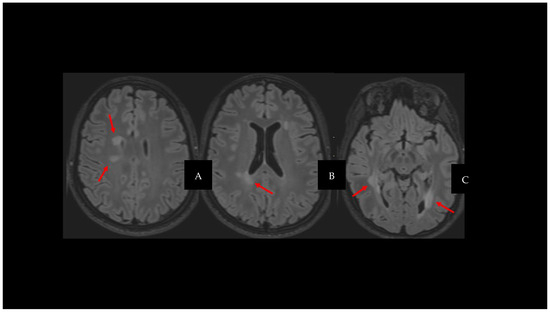Fluid-attenuated inversion recovery (FLAIR), axial plane (A–C); red arrows show white matter lesions.
