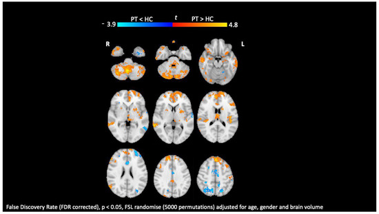 Resting-state insular functional connectivity. Comparison between patients with MS (PT) and healthy subjects (HC). Yellow–red indicates increased insular functional connectivity; light-blue–blue indicates reduced insular functional connectivity. False discovery rate (FDR corrected), p < 0.05, FSL randomize (5000 permutations) adjusted for age, gender, and brain volume.