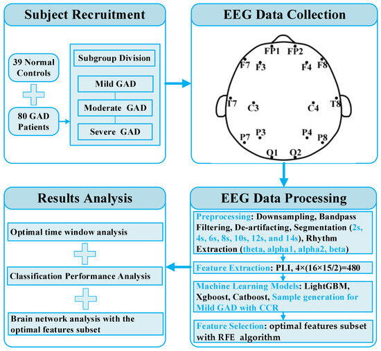 GAD patients were recruited from local hospitals, including 39 normal controls and 80 GAD patients, totaling 119 participants, with an age range of 22 to 68 years. All recruited subjects were diagnosed by psychiatric specialists based on the criteria for GAD outlined in the fifth edition of “The Diagnostic and Statistical Manual of Mental Disorders” (DSM-5). These participants also completed the Hamilton Anxiety Rating Scale (HAMA). The overall analytical framework of this study is shown in Figure 1. In this study, specific conditions were imposed on each participant to ensure the accuracy and reliability of the data: (1) all participants had to be right-handed; (2) participants could not have other psychiatric disorders such as epilepsy, neurodegenerative diseases, stroke, or schizophrenia; (3) participants could not have severe physical disorders; (4) participants could not have a history of drug or alcohol abuse; (5) participants could not have any record of brain injury; and (6) participants had to ensure adequate sleep the night before data collection and avoid smoking, drinking coffee, and strong tea within 2 h before the experiment. Additionally, based on the literature [11] and the total score of the Hamilton Anxiety Rating Scale (HAMA), participants were categorized into different severity levels, including normal, mild, moderate, and severe, as shown in Table 1.