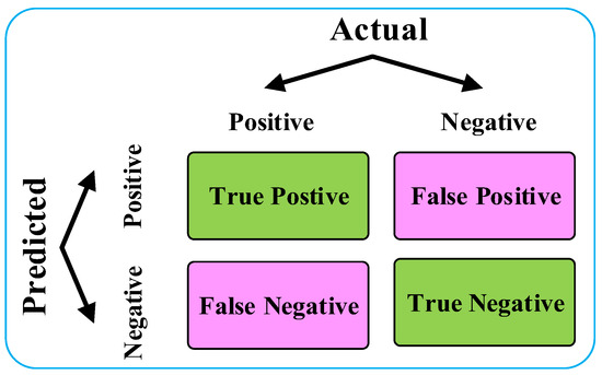 Common evaluation metrics for binary classification models based on the confusion matrix include accuracy, precision recall, and F1 score, as shown in Equations (3)–(6):