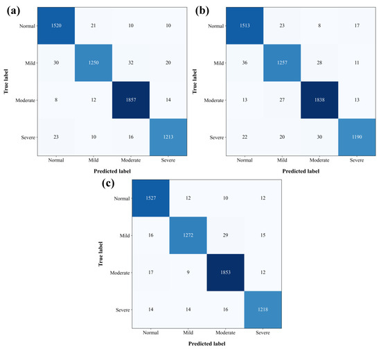 Confusion matrices for LightGBM (a), Xgboost (b), and Catboost (c) models according to Table 7. The darker color of the square indicates a larger value.