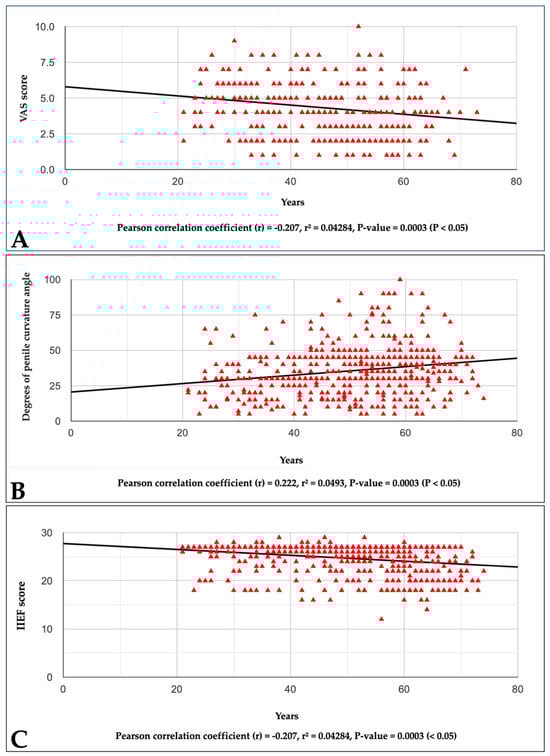 | Between | Degree of penile curvature | and | Age | 0.205 | 0.000002 | YES |