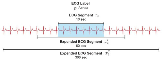 To fully exploit the context information, we extended each 10 s segment to 1-min and 5-min lengths. We first added the preceding and following 25 s part to each 10 s segment , resulting in a 1 min segment , as presented in Figure 2. We then created 5 min segments by pairing each 1 min segment with its two preceding and two succeeding segments. The labels for these 5 min segments corresponded to their central 1 min segment. In this way, we created an overlapped dataset, with a window size of 1 min and a step size of 10 s for the 1 min segments and with a window size of 5 min and a step size of 10 s for the 5 min segments. Despite the overlapped dataset, we could align the actual event counts and the number of event segments simply by aggregating the continuous event segments as a single event. This assumption was justified by the fact that the duration of most sleep-breathing events ranged from 10 to 20 s.