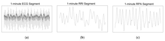We then separately processed both the 1 and 5 min segments to extract the R-R interval (RRI) and R peak amplitude (RPA) signals, which are typical respiratory signals derived from ECG signals. We used the Christov method [15] for R peak detection for this process. We then interpolated the RRI and RPA signals into 180 data points for the 1 min segments and 900 data points for the 5 min segments. The converted 1 and 5 min segments are denoted as and , respectively. We input and into its own dedicated pathway in the model, with each pathway receiving two data channels: RRI and RPA. Figure 3 depicts the original ECG segment along with their corresponding RRI and RPA segments.