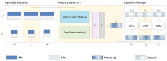 The overall architecture of the model is illustrated in Figure 4. The model consisted of two main components: a feature extractor and a sequence processor. The feature extractor was modeled after the DSF-SANet, a CNN-based model that demonstrates state-of-the-art performance in sleep apnea detection [9]. On the other hand, the sequence processor was based on a gated neural network, which is an advanced model of a recurrent neural network (RNN). A RNN is widely used for tasks engaging sequential data, such as time-series prediction [16,17,18] or natural language processing [19,20] due to its capability to deal with inter-time dependencies and is thus considered appropriate to leverage the sleep-related context within ECG signals [21].
