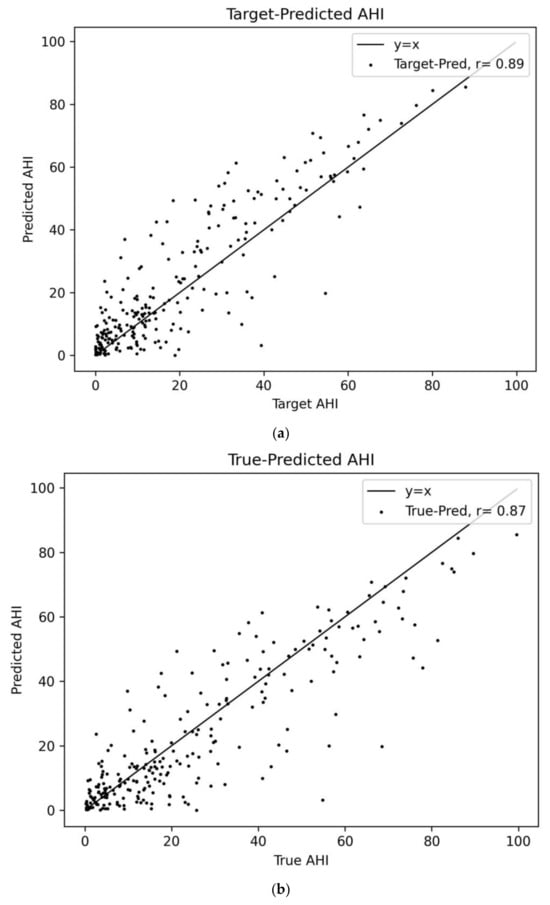 (a) The relationship between the target and the predicted AHI and (b) the relationship between the true and the predicted AHI. AHI: apnea–hypopnea Index.