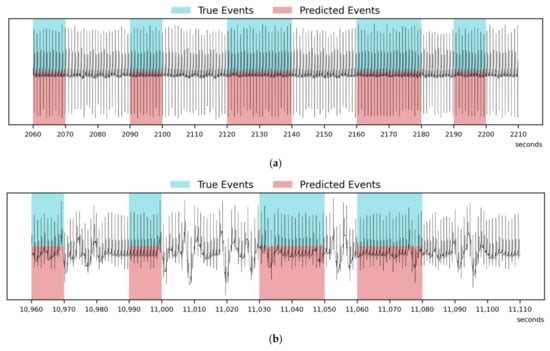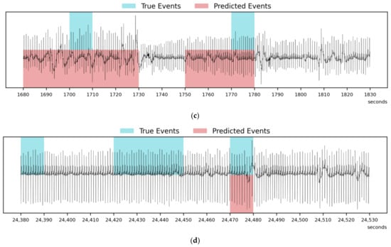A comparative illustration of 150 s sequences demonstrating (a,b) accurate event detection, (c) overestimated event detection, and (d) underestimated event detection.