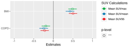 APA StyleWehlte, L., Walter, J., Daisenberger, L., Kuhnle, F., Ingenerf, M., Schmid-Tannwald, C., Brendel, M., Kauffmann-Guerrero, D., Heinzerling, L., Tufman, A., Pfluger, T., & Völter, F. (2024). The Association between the Body Mass Index, Chronic Obstructive Pulmonary Disease and SUV of the Non-Tumorous Lung in the Pretreatment [18F]FDG-PET/CT of Patients with Lung Cancer. Diagnostics, 14(11), 1139. https://doi.org/10.3390/diagnostics14111139