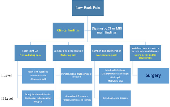 Image-guided procedures are considered minimally invasive treatments for LBP, after failure of conservative therapy [44]. Overall, minimally invasive treatments are far less expensive than surgery and produce good results, as demonstrated in some meta-analyses [45,46,47].