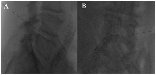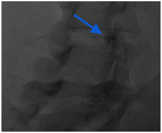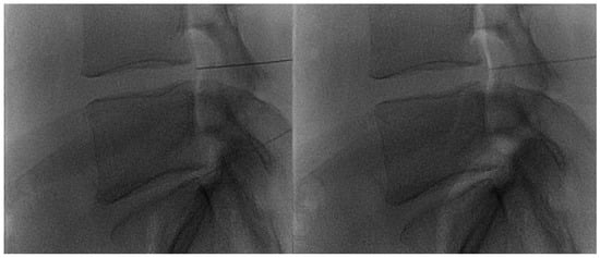 In addition to fluoroscopy (Figure 7) and CT, US can guide the procedure successfully. In a prone position, facet joints are evaluated by a convex probe with low frequency (3–8 MHz) and positioned 3–4 cm lateral to the spinous processes. Once the target has been found, the probe must be positioned in a transverse view in order to observe the articular structures. The puncture is performed by following the tip of the needle with the short side of the probe. Finally, the needle progresses with a lateral-to-medial trajectory towards the final target, which is the hypoechoic space center between the articular surfaces [58,60].