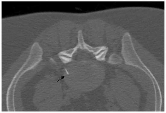 In fluoroscopy, the C-arm may be rotated to an angle of 45° along the same direction of the treated side, producing a superimposed virtual triangle, called the Scotty dog appearance, which guides the needle trajectory [59]. On CT, axial scans easily help to monitor the path from skin to foramen. The target is the foramen radicularis, and root contact is unnecessary. Radiopaque dyes can be used in order to confirm the needle placement if necessary. Therefore, once close to the nerve, medications may be injected, and the needle can be removed (Figure 5) [58,59].