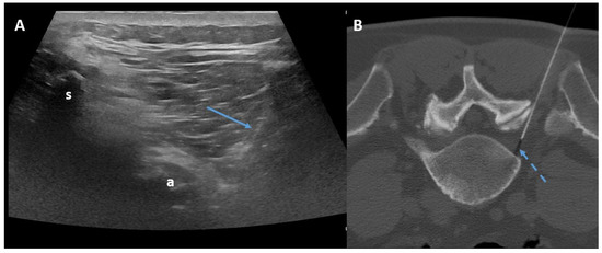 Ultrasound-guided (Panel A) and CT-guided (Panel B) lumbar paraganglionic drug injection. Blue arrow = needle visualized on ultrasound. Dotted blue arrow = ganglion root. s = spinous process, a = posterior articular complex.