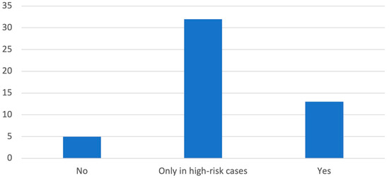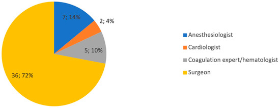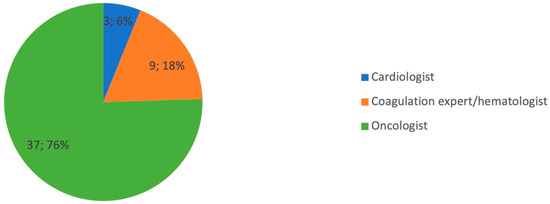 Most of the respondents were at least 40 years old (39/50, 78%) and work in a public hospital (21/50, 42%) or a university (22/40, 44%). Half of them are gynecologists (25/50, 50%) and the other half are oncologists (25/50, 50%) (Table 1). Forty-one of the respondents (82%) consider thromboembolic prophylaxis in gynecologic oncology to be relevant. In most cases (82%), there is a standardized protocol for thromboembolic prophylaxis that is used for both patients undergoing surgery and patients undergoing chemotherapy; remarkably, in 18% of cases, prophylaxis is performed exclusively in patients undergoing chemotherapy. Prophylaxis for the patient undergoing surgery is almost always managed by the surgeon (72%) (Figure 1).