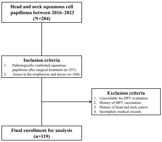 The oropharynx and larynx, prominent sites of head and neck SP, are integral components of the head and neck region that harbor the potential for HPV infection [6,7]. The characteristics of HPV infection in these sites have been evaluated with distinct clinical associations [8,9,10,11]. The causative role in the etiopathogenesis of oropharyngeal squamous cell carcinoma (OPSCC) in the oropharynx is being highlighted [8,9], and the increasing incidence of HPV-related OPSCC warrants further understanding of epidemiological data on oropharyngeal HPV infection [8,9,12]. Recent investigations into oropharyngeal SP (OPSP) have revealed a 14.5% overall prevalence of HPV infection, with high-risk (HR)-HPV accounting for 75% of all HPV-positive cases and HPV16 emerging as the predominant genotype [13]. The larynx is another HPV-tropic site mainly associated with laryngeal SP (LSP). The prevalence of HPV infection reportedly ranges from 83% to 100%, featuring predominantly low-risk genotypes such as HPV6 and HPV11 [10,11,14,15]. Nevertheless, a significant research gap persists, as the majority of previous studies on LSP have focused on recurrent respiratory papillomatosis (RRP), which is a specific clinical manifestation characterized by multiple confluent LSPs, thereby leaving a lack of data for all types, including solitary LSP [16]. The histological characteristics of SP are identical regardless of anatomical sites. Still, potential discrepancies in the prevalence and characteristics of HPV infection are encountered across these two anatomical sites, which requires further investigation of HPV infection in head and neck SP.