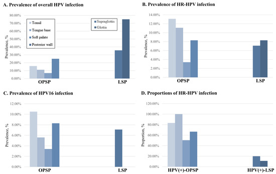 The oropharyngeal subsites included the tonsil, tongue base, soft palate, and posterior wall, and the laryngeal subsites were supraglottis and glottis. The prevalence of overall human papillomavirus (HPV) infection (A), high-risk (HR)-HPV infection (B), and HPV16 infection (C) according to oropharyngeal and laryngeal subsites. The proportions of HR-HPV infection among all HPV infections according to oropharyngeal and laryngeal subsites (D).
