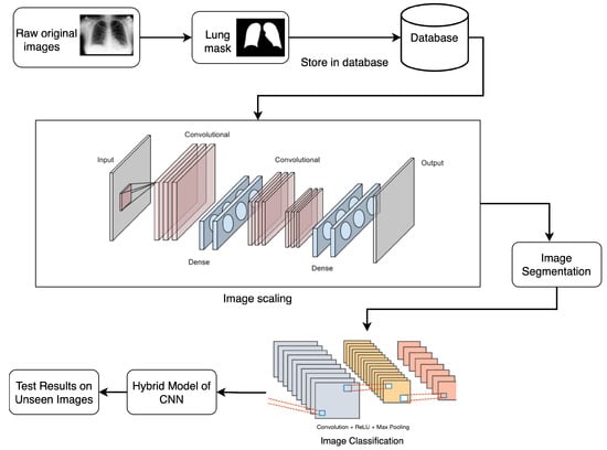 Global health concerns about TB are still significant, especially in areas where access to healthcare resources is scarce [7]. Effective TB treatment and control depend on early detection and accurate diagnosis. Chest X-rays are a commonly used diagnostic method for TB screening, since they are inexpensive and easy [8]. It can be challenging to interpret chest X-rays for the diagnosis of TB, especially in places with few resources and a lack of radiology with the necessary training [9]. Recent advancements in deep learning techniques have shown the promise for automated identification of TB from chest X-ray images [10]. This article proposes a novel approach integrating segmentation and classification models to enhance the accuracy of TB detection employing chest X-rays. Specifically, X-rays were used, as they are convenient to store, transmit, and analyze, plus they are easily accessible and are cost-effective for every patient. By combining segmentation techniques to identify areas of concern with algorithms for classification to distinguish between patients who are TB-positive and those who are TB-negative, this combination strategy aims to improve TB diagnosis sensitivity and specificity.