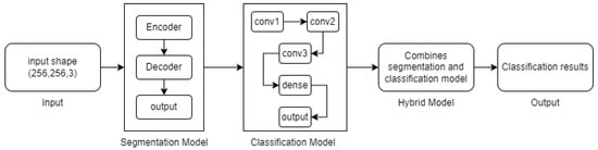 Pseudocode in Section 3.3 of the proposed model explains the working of the model’s input, its segmentation, its classification, and its results. The model accepts an input shape of (256 × 256 × 3) that is given to the segmentation model, where the input image is encoded using conv2D and maxpooling2D layers. Then, it is decoded using upsampling2D and conv2D layers, and it provides the segmented images that are then given to the classification model as input. The images are further classified using multiple conv2D and maxpooling2D layers; furthermore, in the classification process, one flattened layer and two dense layers are utilized to finalize the classification. Finally, a hybrid model is designed using both segmentation and classification models.