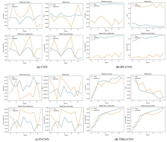 Every model’s loss curve, accuracy curves, Jaccard index curves, and Dice coefficient curves are shown as a whole, e.g., Figure 4d presents all the four metrics curves that were calculated during training of the TSSG-CNN model. The metrics show highly accurate results for prediction by providing accurate graphs. On the other hand, DCNNs in Figure 4c show irregularity in the curves with low accuracy. The Jaccard index and Dice coefficient curves show low curves.