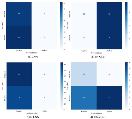 The remarkable accuracy of the TSSG-CNN model in training and testing indicates how well it addresses the underlying issue and increases the likelihood that it will be helpful in practical settings. These results validate the effectiveness of the TSSG-CNN model and emphasize its significance in pushing the boundaries of the current state-of-the-art in the area. The classification model performs admirably across two classes, as seen by the confusion matrix in Figure 5d. The model correctly classifies 38 examples as falling into the first class and 41 instances as belonging to the second class, demonstrating its ability to distinguish between the two classes. The relatively low number of class misclassifications by the model serves as additional evidence of its efficacy. On the other hand, CNN and D-CNN models in Figure 5a,c were not able to differentiate between the two classes and generated false results; meanwhile, BN-CNN in Figure 5b was able to differentiate between them, but its results were not as accurate, since it misclassified instances.