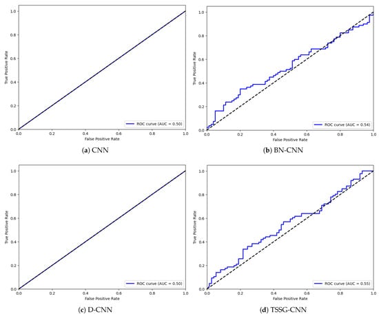 The same was performed with Receiver Operating Characteristic (ROC) curves, just as confusion matrices were used to examine the poor-performing classes out of the target column. The Receiver Operating Characteristic (ROC) curves are presented in Figure 6 to draw the true positive rates against false positive rates. The model TSSG-CNN represented in Figure 6d developed curves of good model performance in the new environment. At the same time, BN-CNN represented in Figure 6b also presented good outcomes. However, Figure 6a,c of both the CNN and the D-CNN have plotted relatively less accurate curves, which signify the poor performance of these models.