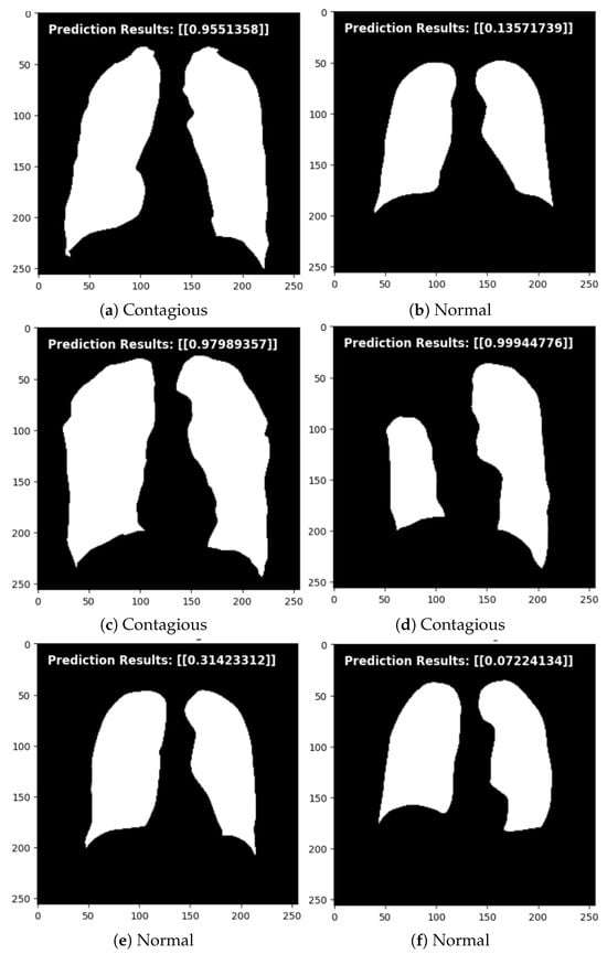 The TB Segmentation-Guided Detection (TSSG-CNN) model was tested using a set of never-before-seen images after being trained on a dataset comprising images of both contagious and normal cases of TB. To assess the model’s capacity for generalization and precise TB case classification, a set of carefully chosen images representing a range of situations and settings was fed into the model. The TSSG-CNN model performed remarkably well, efficiently differentiating between typical cases and those that suggested TB transmission, as seen in Figure 7. The model demonstrated its effectiveness in real-world circumstances outside of the training dataset by effectively utilizing learned features to identify important patterns and traits indicative of TB infection through the use of deep learning architecture.