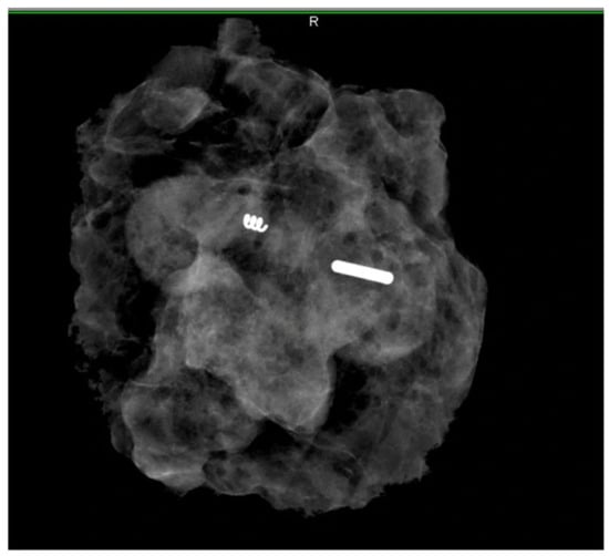 A specimen radiograph demonstrating the 125I seed in a specimen in the lymph node in addition to the marker coil. Reproduced from Zatecky et al. [13].