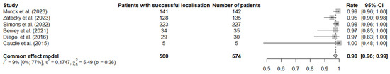 Forest plot demonstrating the pooled successful localisation rate [13,18,19,20,21,22].
