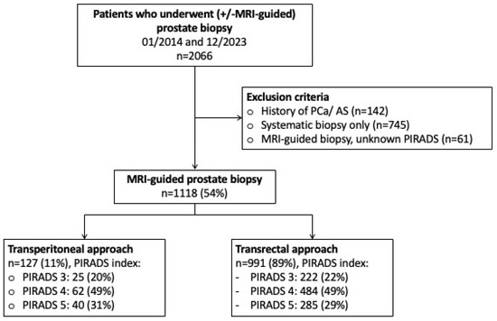Following approval of the institutional review boards of the University Cancer Centre Frankfurt and the Ethical Committee at the University Hospital Frankfurt (SUG-2-2018_A2023), patients who obtained a transrectal or transperineal MRI-guided prostate biopsy between 01/2014 and 12/2023 were retrospectively identified within our prospectively maintained database. As previously described patients with suspicious MRI findings (PIRADS 3, PIRADS 4, PIRADS 5) according to the Prostate Imaging Reporting & Data System [PIRADS Version 2.0, PIRADS Version 2.1] underwent MRI-guided biopsy of the lesion combined with a systematic prostate biopsy [17,18]. In the case of multiple lesions, MRI-guided biopsies covered all suspicious lesions separately according to standardized institutional protocol [19,20]. MRI-guided biopsy was performed with two high-end ultrasound machines (Transrectal: HiVison, Hitachi Medical Systems, Tokyo, Japan; transperineal: KOELIS Trinity System, Koelis, La Tronche, France). For MRI-guided biopsy, at least two cores were taken from each mpMRI lesion ≥ PIRADS 3. Between 01/2014 and 05/2023 (systematic and MRI-guided) prostate biopsies were performed via a transrectal approach (Hitachi Medical Systems), which was transitioned to a transperineal approach (Koelis) beginning in 06/2023. Among all patients who underwent prostate biopsy between 01/2014 and 12/2023 (n = 2063), patients with a previous history of prostate cancer (n = 142) were excluded. Subsequently, patients undergoing solely systematic prostate biopsy (n = 745) as well as patients with unknown PIRADS information (n = 61) were excluded, resulting in the final study cohort of 1118 patients obtaining a combined (MRI-guided and systematic) prostate biopsy in our tertiary care center (Figure 1).